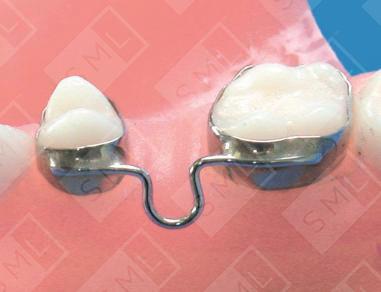 When a tooth is missing in the posterior aspect of the arch, an interim bridge can be used to maintain space and stabilize the area without having to prepare the teeth. This technique is particularly useful if buccal/lingual walls of the teeth to be banded are subject to fracture. An example of this would be teeth with very large MOD alloys. In this case, the bands would act to hold them together. This particular appliance is designed with an adjustable buccal wire. A simple adjustment with a 139 bird-beak plier will allow you to gain a small amount of lost space or upright a tooth that has tipped slightly into the edentulous space.
