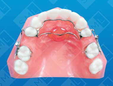This popular molar distalizer can be used on either arch and can also be used in a unilateral or bilateral configuration. The anterior portion typically attaches to the first bicuspid bands with a Nance Button -- and often with an additional lingual wire for anchorage. Vertical tubes on the buccal aspect of these bicuspid bands accept the .032 guide wires that run back through the horizontal tubes on the molar bands. Gurin Locks and open coil springs are placed to provide the necessary distalizing force to the molars. Adjustments are made approximately every 3-4 weeks. Vertical tubes allow it to be placed segmentally, by first cementing the anterior segment, and then placing the molar bands (with .032 guide wires inserted in the tubes) as individual units. The appliance shown here is a depiction of the force module needed to distalize #14 -- and also of the use of the Gurin Lock to maintain the already distalized #3. Note: When selecting this appliance, please provide the lab with detailed instructions.