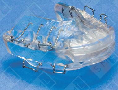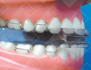 CT scans taken with this device in place show that the tongue is more superiorly placed with a narrowing of the dorsal aspect. There is also an enlargement of the airway. This appliance uses multiple clasps to positively lock the mandible into the appliance and prevent it from retruding. There is also a larger airway cut into the acrylic in this design. The position of the mandible must be predetermined and accurately produced in a construction bite for proper appliance fabrication. Typically, the mandible must be advanced to only 75% of its maximum protrusion with the anterior/vertical separation of 4mm. This prevents excessive strain on the TMJ and facial musculature.