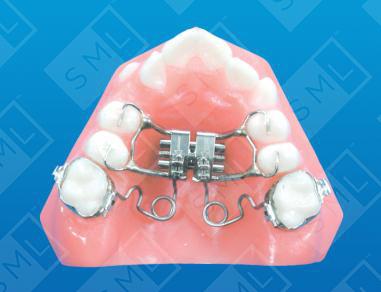 Similar to the Hilgers/Pendex appliance in both use and design, the Grumrax Appliance can develop an arch laterally and has the functional capacity to distalize and rotate the molars at the same time. There are, however, a few design modifications that make this appliance quite unique. The first design distinction is the use of an R.P.E. screw...and the obvious absence of any palatal acrylic. The second is the attachment of the distalizing springs to the body of the R.P.E. screw via horizontal sheaths. The distalizing springs are fully removable, making them easier to initially activate and reshape throughout treatment. They can also be unilaterally activated. This design is also more hygienic -- an excellent choice for patients exhibiting already-compromised dental hygiene. Other advantages provided by the "M" Pendulum Spring, can be viewed in the "M" Pendex Appliance section. Note: When an increase in arch length and width are both needed, many practitioners prefer to idealize the position of the molars at the same time that they expand the arch. Others prefer to initiate molar distalization several weeks (2 to 4) after transverse changes begin. Either way, once these movements are accomplished, the bicuspids and cuspid will have to be brought back in the arch form one at a time using fixed mechanics.