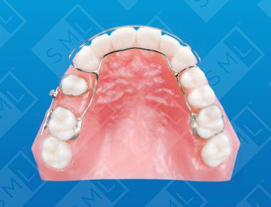 The typical anchorage system used when you wish to unilaterally move a bicuspid mesially, while preventing reciprocal movement of the other teeth. This appliance uses nickel titanium coil spring and an adjustable Gurin Lock. Note: Activating the Gurin lock is easily accomplished with a special box wrench (available from SML).