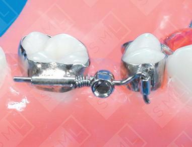 This appliance works in much the same way as the CD Distalizer. However, the design has been modified with the guide wires soldered to the first bicuspids (rather than using the vertical tube assembly to attach them to the bicuspids). Advantages: superior strength and added patient comfort -- attachments to the bicuspids are smooth and reduced in overall bulk. Although this design requires all four bands to be seated at once, this is typically not a problem. Appliance shown depicts the force module necessary to distalize #14 -- and use of the Gurin lock to maintain the already distalized #3. Note: Gurin Locks and open coil spring provide the necessary distalizing force to the molars.