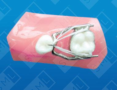 Regaining space may be accomplished by using a Band and Loop Unilateral Space Maintainer with sliding molar tubes and coil springs. This setup applies constant tension and may be used to move a premolar mesially with some reciprocal distal movement of the permanent molar. To adjust the appliance, simply stretch the coil springs prior to the initial seating of the appliance. No further adjustment is usually necessary. Note: To aid in easy insertion of this appliance, it is recommended to first pre-assemble the activated appliance on the working model. Then use dental floss to hold the activated loop passive during cementation.