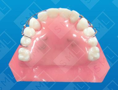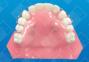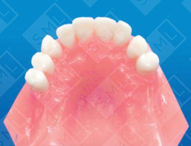 This appliance demonstrates the versatility of treatment partials. In this scenario, all of the anteriors are flared due to a loss of posterior support and periodontal disease. Specifically, both cuspids and the left lateral need to be moved lingually prior to gathering the rest of the anteriors and placing an intra-coronal splint. To accomplish this tooth movement, T-springs are used to move the cuspids and lateral lingually. Then, to finish gathering the anteriors, an elastic is placed across the labial surface of the anteriors stretching from hooks on the labial bow at the first bicuspids. All of this tooth movement takes place using a temporary treatment partial. Once all of the desired tooth movement is complete, an intra-coronal splint will be placed so that the splinting will not interfere with the design of the permanent partial.