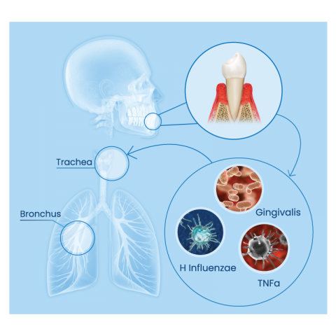 The gateway? Inflammation creates bacterial plaque which can be aspirated into the lungs where colonization and infection result in airway compromise, increased immunological susceptibility, and full-on obstructive pulmonary infection.