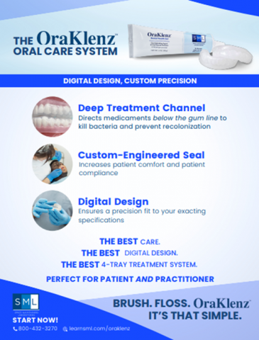 Integrated into a patient’s regular hygiene regimen, the OraKlenz Oral Care System – via the application of patented OraKlenz trays and gel - will measurably eliminate gum disease in a few weeks…while continuing to provide optimum oral and systemic gateway protection when used as part of a regular dentist-prescribed treatment program.
