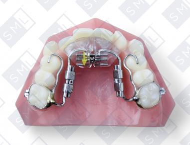 This appliance is used for pre-maxillary and lateral development when patient compliance may be a concern. The midline expansion screw is placed in acrylic that it finished up against the anteriors. The two laterally placed expansion screws provide the desired pre-maxillary development, while the midline screw can provide any needed lateral development, up to 3mm to 4mm.