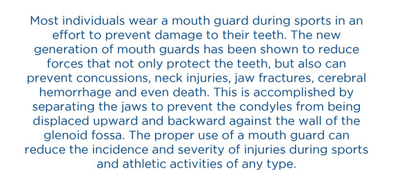 Most individuals wear a mouth guard during sports in an effort to prevent damage to their teeth. The new generation of mouth guards have shown to reduce forces that not only protect the teeth, but also can prevent concussions, neck injuries, jaw fractures, cerebral hemorrhage and even death. This is accomplished by separating the jaws to prevent the condyles from being displaced upward and backward against the wall of the glenoid fossa. The proper use of a mouth guard can reduce the incidence and severity of injuries during sports and athletic activities of any type.