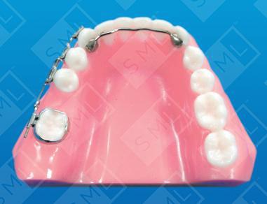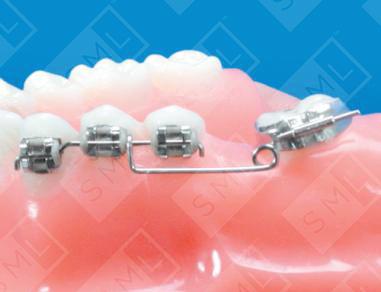 A variety of fixed appliances are available to upright tipped molars. Although the design and application may vary slightly, the principles are the same. The key to success is to set up adequate anchorage. In this example, an anchorage unit is created by placing edgewise brackets on all teeth as far forward as the canine. These are then tied together with a segmental guide wire and metal ligature ties. The canine on the contralateral side is also included in the anchorage unit by using a lingual arch, to not only increase the anterior anchorage, but to also help resist against any buccal displacement of the anchor teeth. Although direct bonded brackets are available for the molar as well, it is advisable to band the molar. The actual uprighting of the molar is done with a rectangular helical uprighting spring by first placing the distal side of the spring in the special rectangular slot on the molar band so that the mesial arm will lie passively in the vestibule. Then, simply lift the mesial arm of the spring and hook it over the arch wire in the stabilizing segment. It is important that the hook be positioned so that it is able to slide distally as the molar uprights. A slight lingual bend, placed in the uprighting spring, is needed to counteract the forces that tend to tip the anchor teeth buccally and the molar lingually.