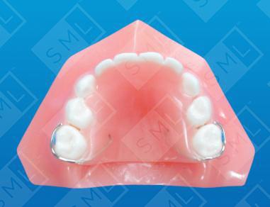 This removable appliance features replacement teeth for the four primary anteriors. It is often called a “flipper” because patients tend to play with it, flipping it in and out. This can easily be avoided by creating extra retention with a combination of additional clasps and/or direct bonded buttons as shown in the insert photo. However, patient cooperation is essential when using removable pedo partials. If cooperation is questionable, we recommend using a fixed approach. Note:As with all bridges and partials, opposing models and a bite registration are necessary for proper construction.