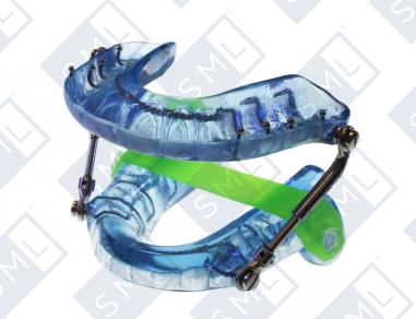 The upper and lower trays are joined by two bars placed along either side. The bars allow the lower tray to be advanced forward, thus comfortably opening the airway.